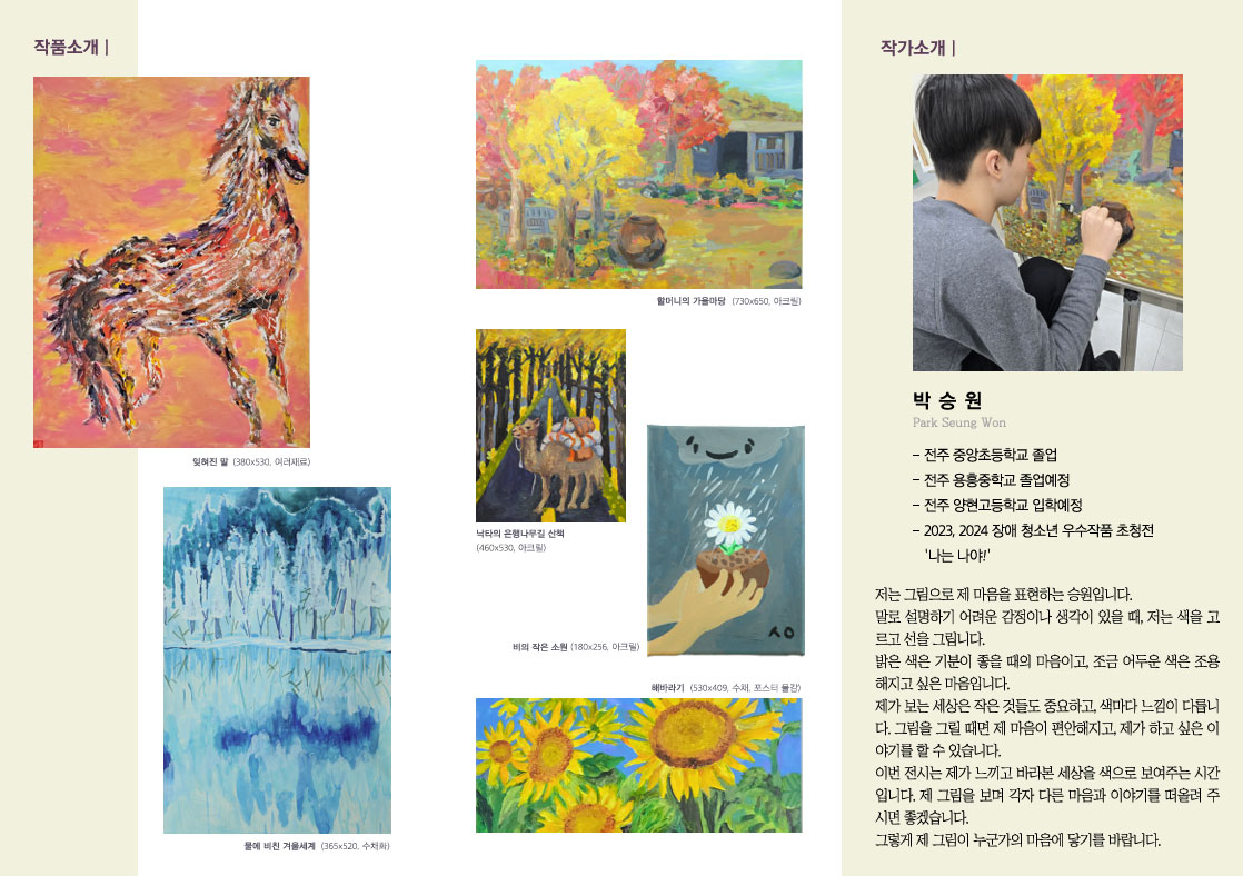 '마음을 그리는 색'은 승원이가 바라본 세상과 마음의 결을 담은 제목입니다.